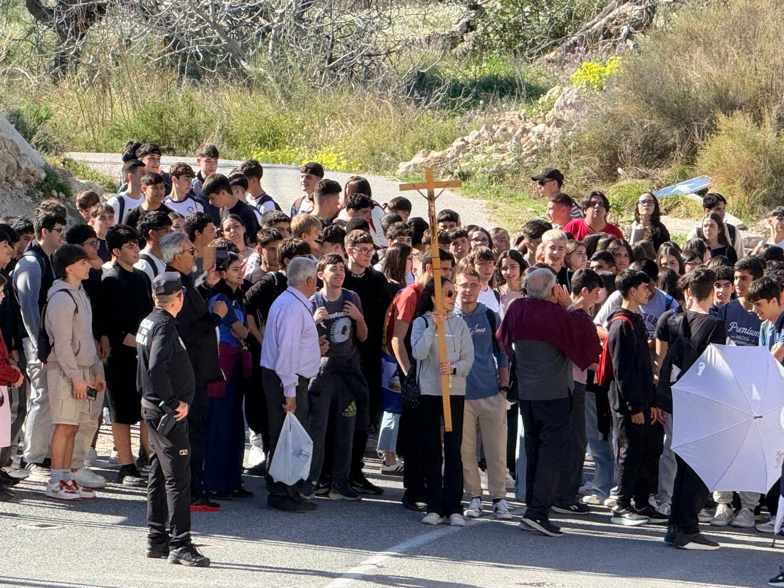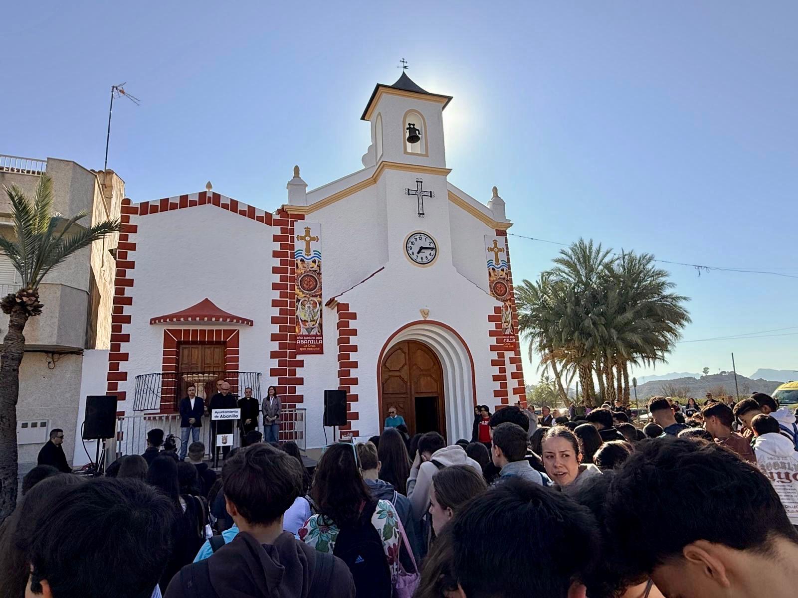 La jornada comenzaba a primera hora de la mañana en la Ermita de la Santa Cruz de Mahoya, lugar donde, según la tradición, fue hallada la reliquia hace cinco siglos. Tras la acogida y el acto institucional —con la presencia del Sr. Obispo, el consejero de Educación y el alcalde de Abanilla— los jóvenes iniciaron la estación jubilar y la peregrinación hasta la parroquia de San José.